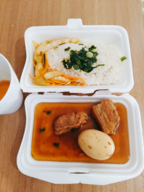 食事のデリバリーを続けていると、だんだん自分の好きなお店が決まってきます。この豚の角煮弁当は、前回間違って店の名前を紹介してしまいましたが、料理名はThịt kho hột vịt (ティット コー ホー ビット)でした。訳すと「アヒルの卵と肉シチュー」らしいです。