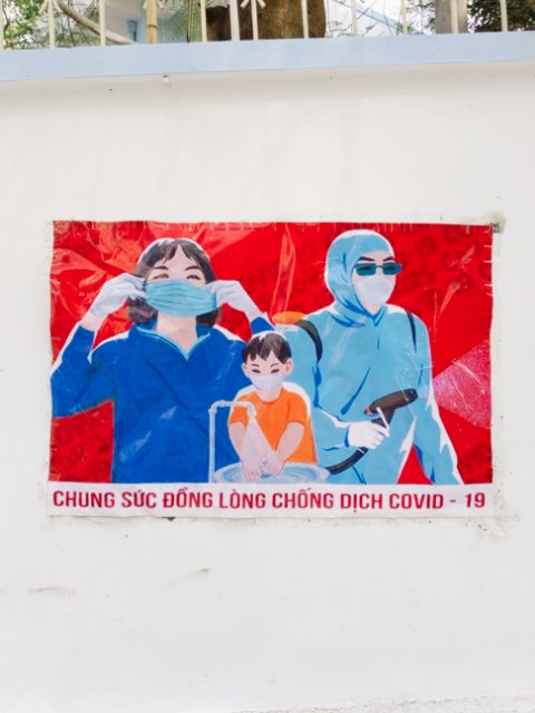 「chung sức đồng lòng chống dịch COVID-19」をGoogle翻訳してみると「流行のCOVID-19と戦うために、力を合わせる」という力強いメッセージでした。