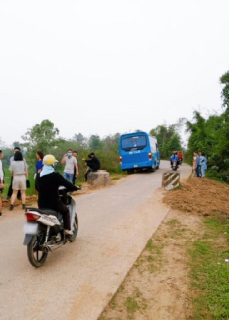 途中にあったブロックが道幅を狭めており、バスがこれ以上進めず、皆で思案しているところです。「ハノイに帰ろう」「いや、ご祝儀渡してないから」などと議論してたら、ちょうど親戚がバイクで通りかかりました。新人の男子が全員分のご祝儀を預かり、バイクの後ろに乗って新郎の家まで届けることで無事解決しました。