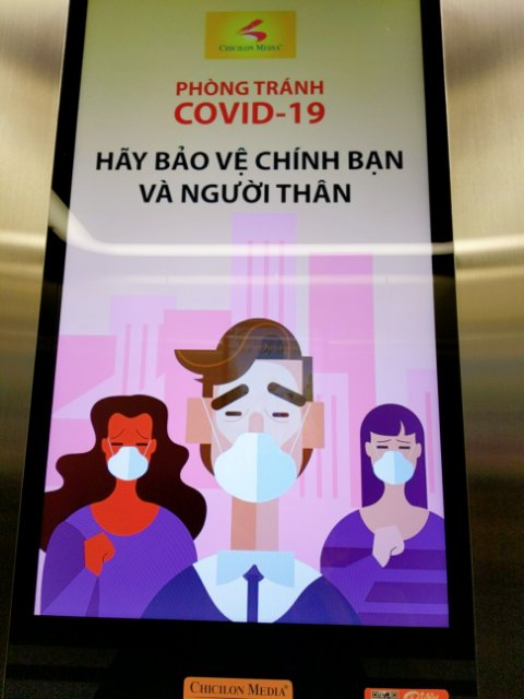 ちょっと、話は変わりますが、これはエレベーター内の広告です。このコロナ予防の広告は、おそらく、政府系機関が出してるんじゃないですかね?ベトナムでは、しばらく新規感染者は出てないようですが、まだ警戒は続いてます。