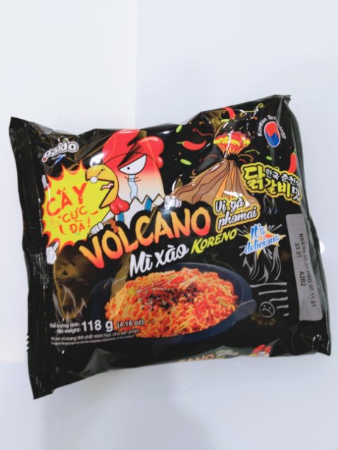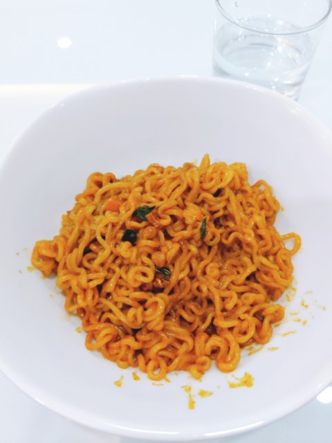 夕飯は買い置きしてた激辛焼きそばです。パッケージの右上に「コリアン・テクノロジー」の文字が見えます。