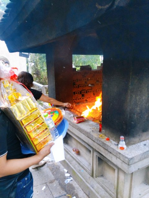 ダミーのお金などを燃やして、「天に住んでる祖先にお供え物を渡す」という儀式だそうです。最近では、スマホ、車、はたまた、紙でできた家を燃やして、祖先にプレゼントする猛者もいるそうです。