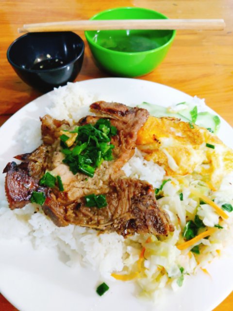 ご飯ものを物色してたら「Cơm Sài Gòn」<コム サイゴン>という看板を見つけました。食べごたえある甘ダレの骨付き肉が乗ってる、ホーチミン市(旧名サイゴン)でよく見かけるスタイルです。そう言えば、ハノイでは見たことなかったですが、「ご飯ものを食べたい」ニーズは必ずあるので、狙いはかなり良いですね。