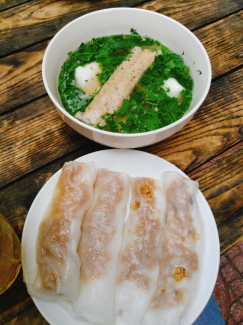 お昼ごはんはこちら。バインクオンをスープに浸して食べるスタイルです。(phở vịt quay)