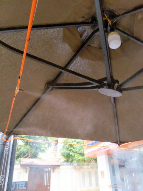 頭上に設置されたスプリンクラーから、霧が降ってくる仕掛けになってます。暑さを和らげてくれるのは、ありがたいんですが、食べ終わった頃には、髪やスマホが濡れてました。
