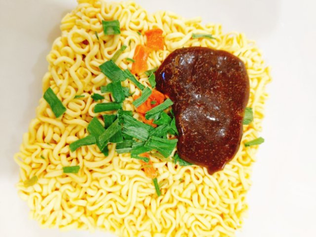 まず、レトルトパック以外のかやくとソースを乗せて、お湯を入れて3分待ちます。