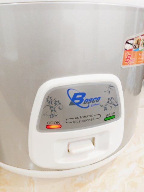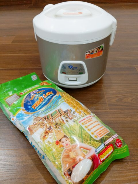 部屋に備え付けの炊飯器を初めて使ってみます。そして、手前は数日前に買ったタイ米。