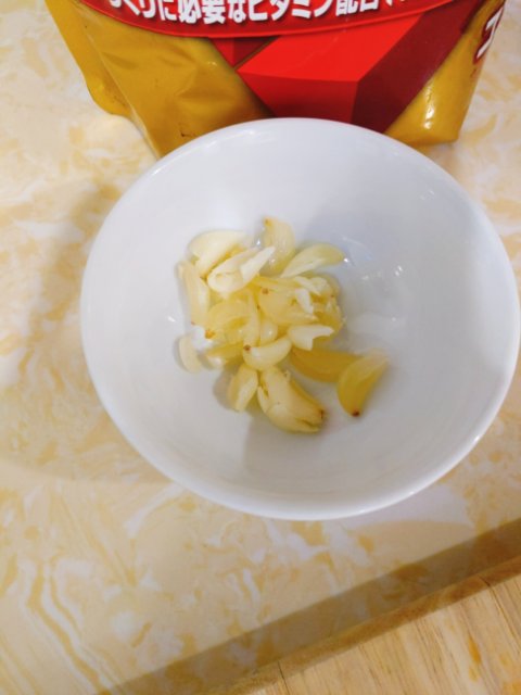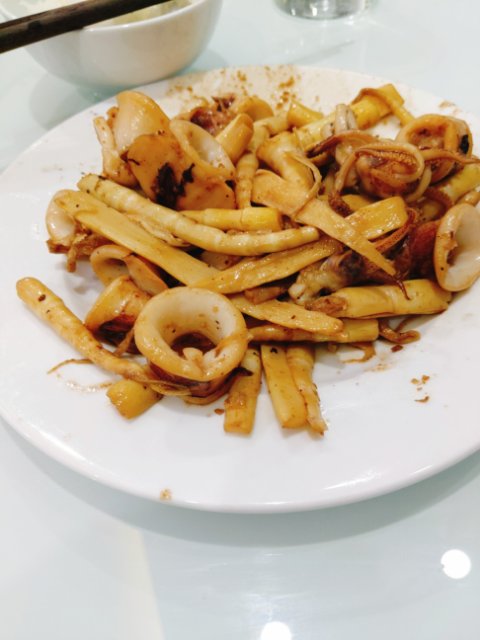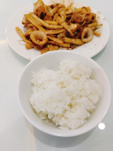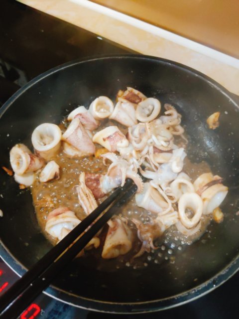 タケノコを茹でてる間、ニンニクとイカを醤油で炒めます。