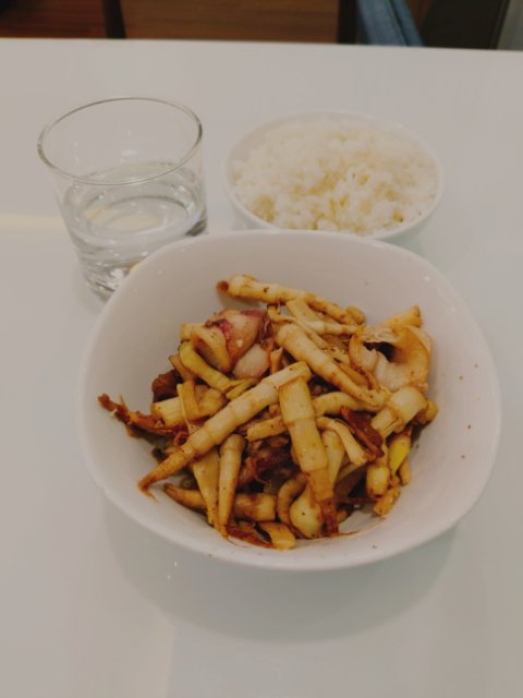 晩ご飯は昨日の漁師めしこと「イカとタケノコの炒めもの」