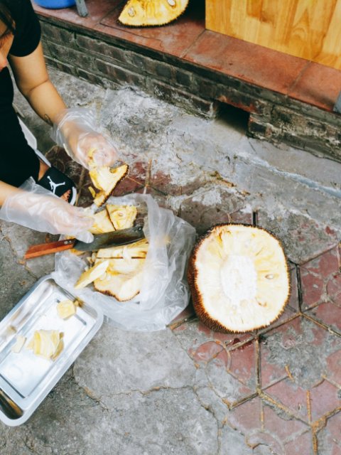 お昼に馴染みの喫茶店に行くと、店先でスタッフのお姉さんがmít<ミット>(ジャックフルーツ)を切ってました。なんで切ってたのか分かりませんが、「どうぞ、食べて」と言われ、数切れもらいました。美味しかったです。