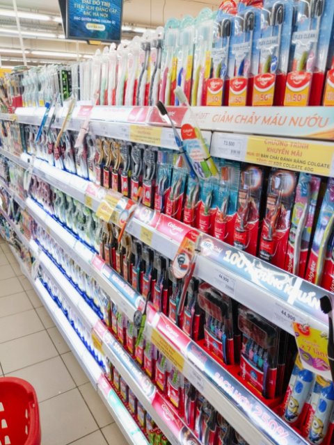 歯ブラシがボロボロになってきたので、新しいのを買いに来ました。この棚、全部歯ブラシです。種類多くないですか?ベトナム人は歯が綺麗な人が多いのと関係してるのかも。