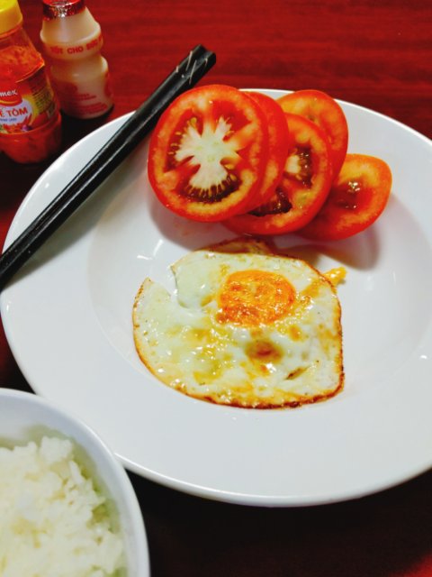 帰宅後、夕飯食べました。おかずが少ないときは、サテトムをご飯に乗っけて食べてます。(左端に見切れてるやつ)