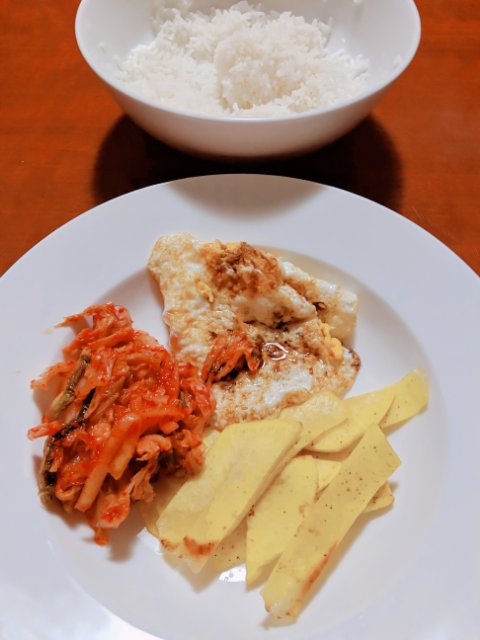 もち米の上に乗せるトッピングの肉や卵はお店によって様々です。ここはカフェなので、食事はまあジャンクっぽい感じですね。
