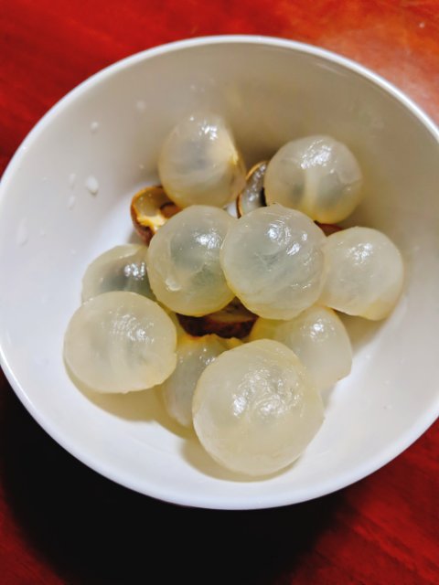 昨日の残りのリュウガン。表面が木の皮みたいに少し固いので、包丁で切れ込みを入れるとサクサク剥けました。