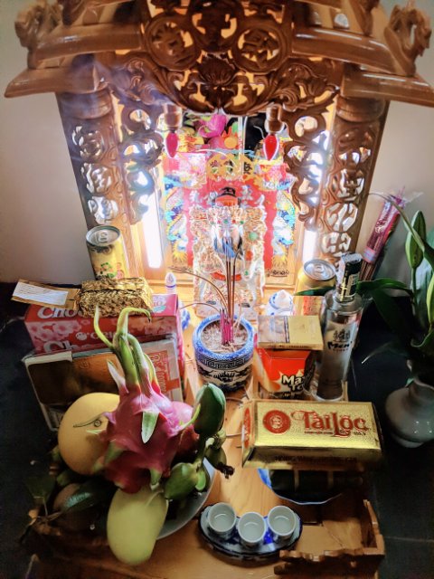 ベトナムのお店には必ず仏壇がありますが、新年に向けていつもより余計に輝いてます。
