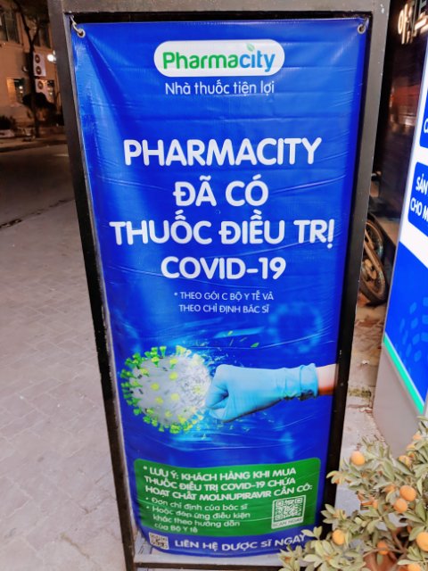 看板には「PHARMACITY ĐÃ CÓ THUỐC ĐIỀU TRỊ COVID-19」(ファーマシティ(薬局名)にはコロナ治療薬がありました)と書いてます。