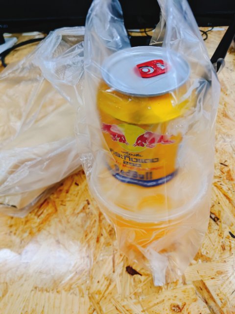 昼飯は、レッドブルのおかわり、オレンジジュース、そして卵バインミー。