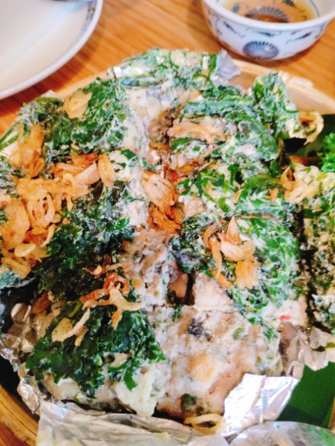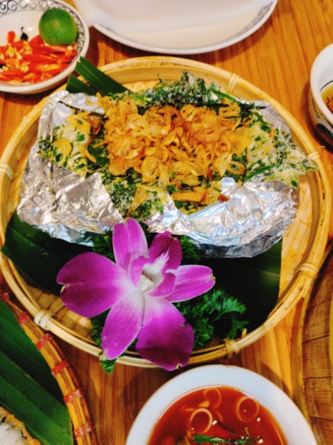 こちらも米粉だと思うんですが、柔らか目の餅のような生地の上に、エビをすり潰したソースが乗ってます。