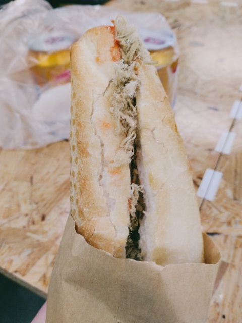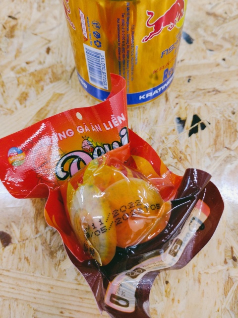会議が終わった後に、朝ごはんの卵とレッドブル。