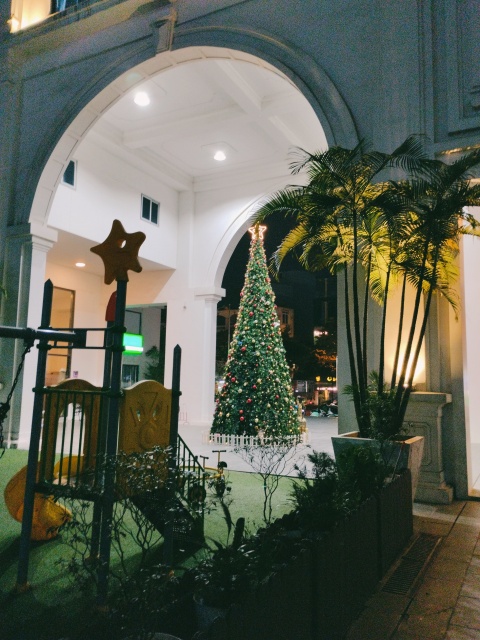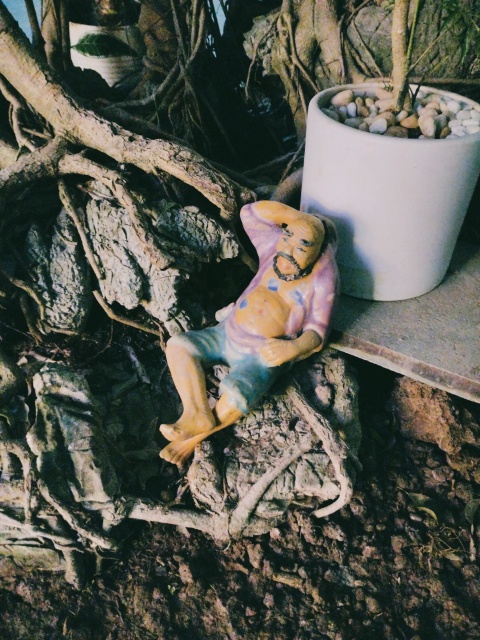 オフィスビルの中庭にある、ベトナム盆栽に置かれた人形でも見て肩の力を抜きます。