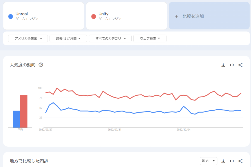 最近、ゲーム制作に興味があって、「Google トレンド」というWebツールで、どちらのゲームエンジン(ゲームを作るためのツール)が優勢か調べてました。