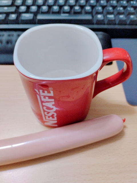 帰宅後、魚肉ソーセージをつまみに晩酌してるところです。