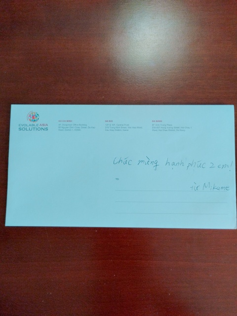 参加者はまず会社に集合してバスで移動するので、ご祝儀だけ持って行ってもらうことにしました。(ベトナムのご祝儀は普通の封筒でOK)