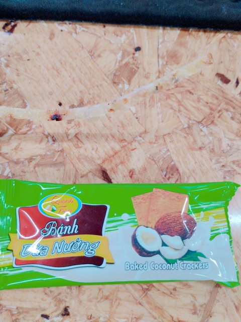 (ココナッツ・クッキーの上に魚の加工品も写ってるんですが、机の模様と同化してますね)