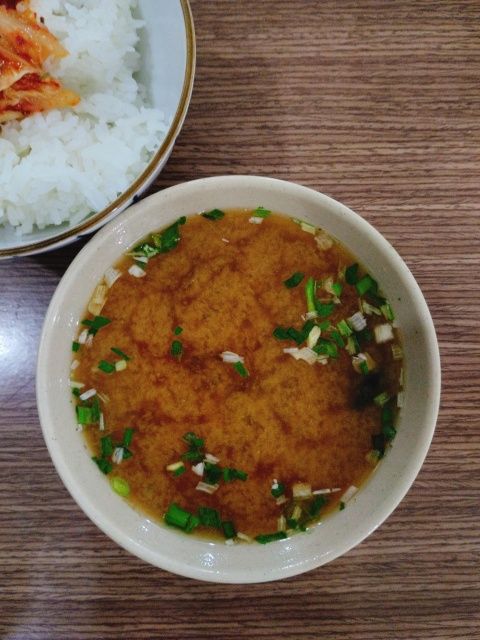 残業を少しやった後、アパートに戻って、日本から持ってきた味噌汁をすすってるところです。