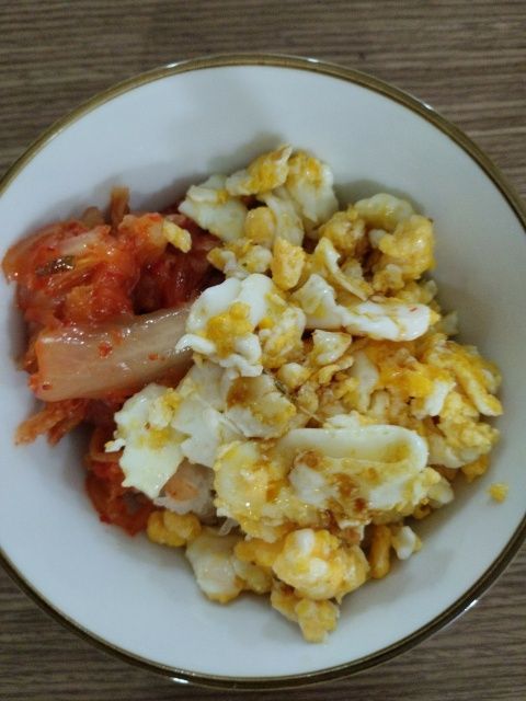 アパートに戻って、創作料理「卵キムチめし」を平らげ、