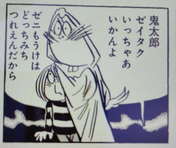 70年代に週刊誌向けに連載されていた鬼太郎の一コマですが、当時の僕は小学生だったので、妖怪退治がほとんど出てこないこのシリーズは、買ってすごく後悔しました。