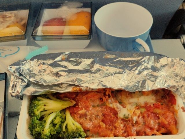 機内食はマカロニのトマトソース和え