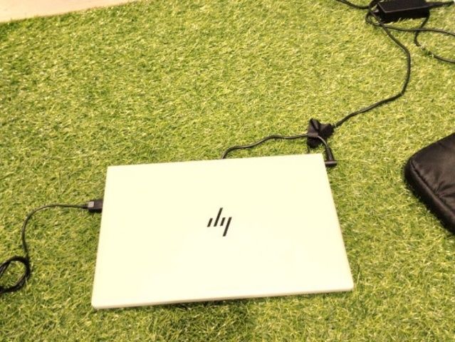 午後、休憩スペースにある人工芝の上でオンライン会議中。