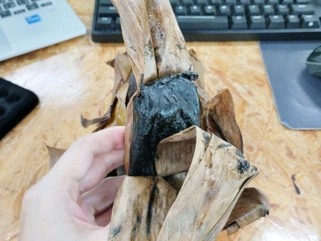 草餅ですが、確かバナナの皮で包むことで黒くなるんですよね。(あとで調べたら、黒は「ガイ」という葉の成分によるもので、餅を包んでいるバナナの葉とは関係ありませんでした…)