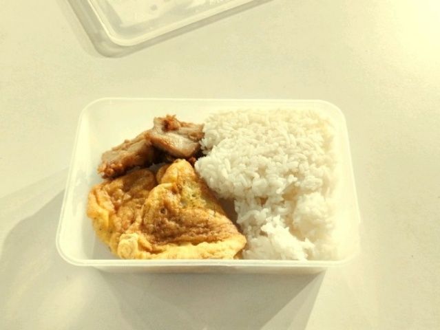 そして14時過ぎに自作の「焼肉・卵弁当」を食べているところです。