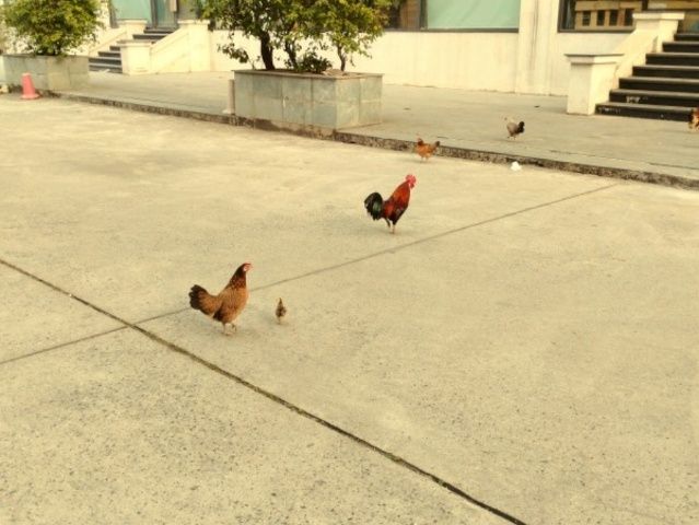 旧正月の町では、人がいなくなった代わりに、ニワトリ達が闊歩しています。