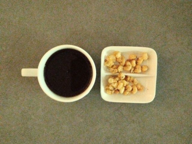 アパートに戻って、コーヒーとトウモロコシで休憩している様子です。